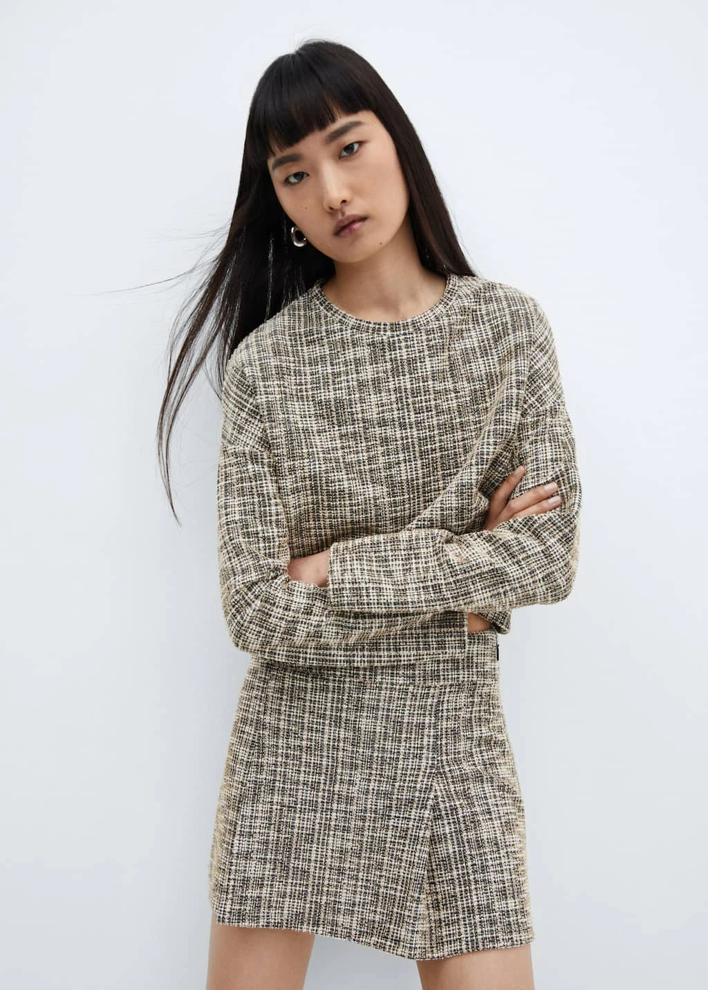 tissu de coton melange, tissu tweed, coupe courte, coupe droite, imprime jaspe, col rond, manches longues, total lookComposition: 82% polyester,16% coton,1% elasthanne,1% polyester avec revĂȘtement de cuivre. Lisiere: 100% viscose