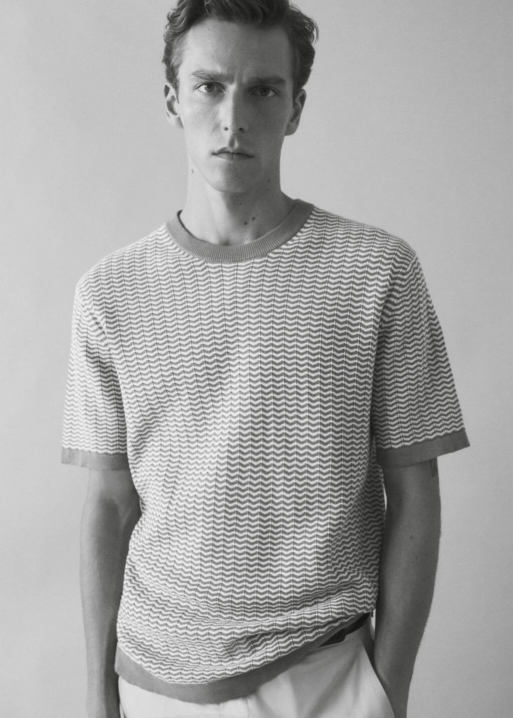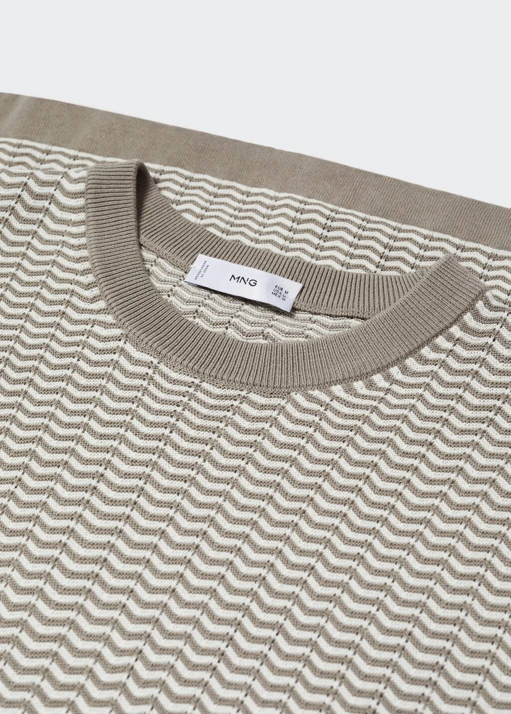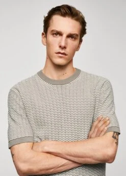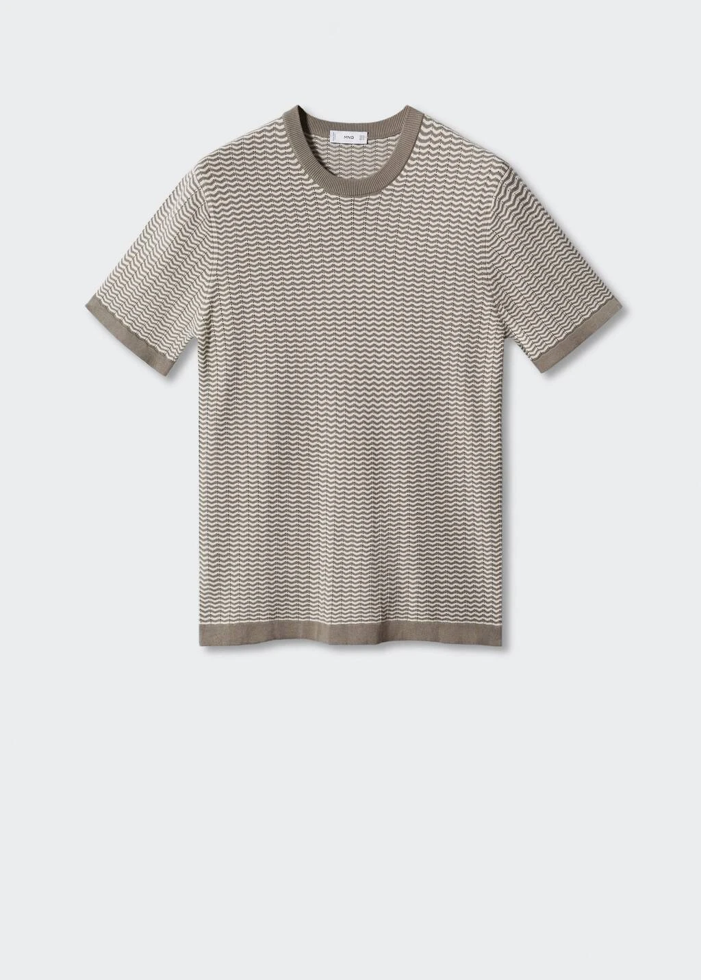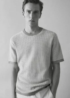 100 % coton, regular-fit, coupe droite, structure en zigzag, tissu en maille fine, col rond, manches courtes, bords elastiques contrastants, le mannequin mesure 190 cm et porte une taille mComposition: 100% coton