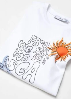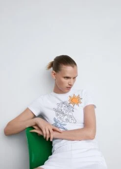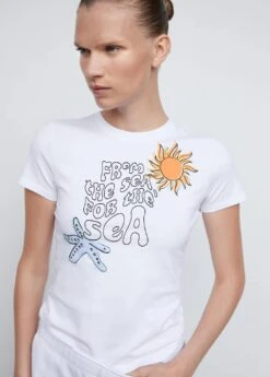 tissu de coton et lyocell melanges, coupe droite, imprime sur le devant, col rond, manches courtes, ce vetement est fabrique en pyratex®, un tissu innovant produit au portugal a partir d’un melange d’algues marines, de cellulose de bois et de coton. les algues sont recoltees selon un processus controle qui n’extrait que la partie de la plante qui peut etre regeneree. tous les benefices seront reverses au laboratoire de posidonies de l’association vellmari, un projet de conservation qui restaure l’ecosysteme mediterraneen. de la mer, pour la mer.Composition: 80% coton,20% lyocell