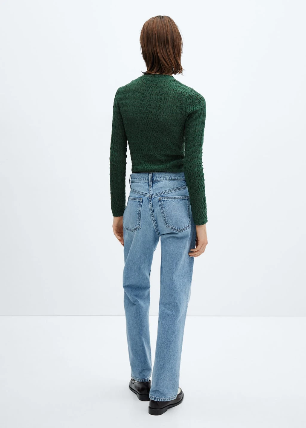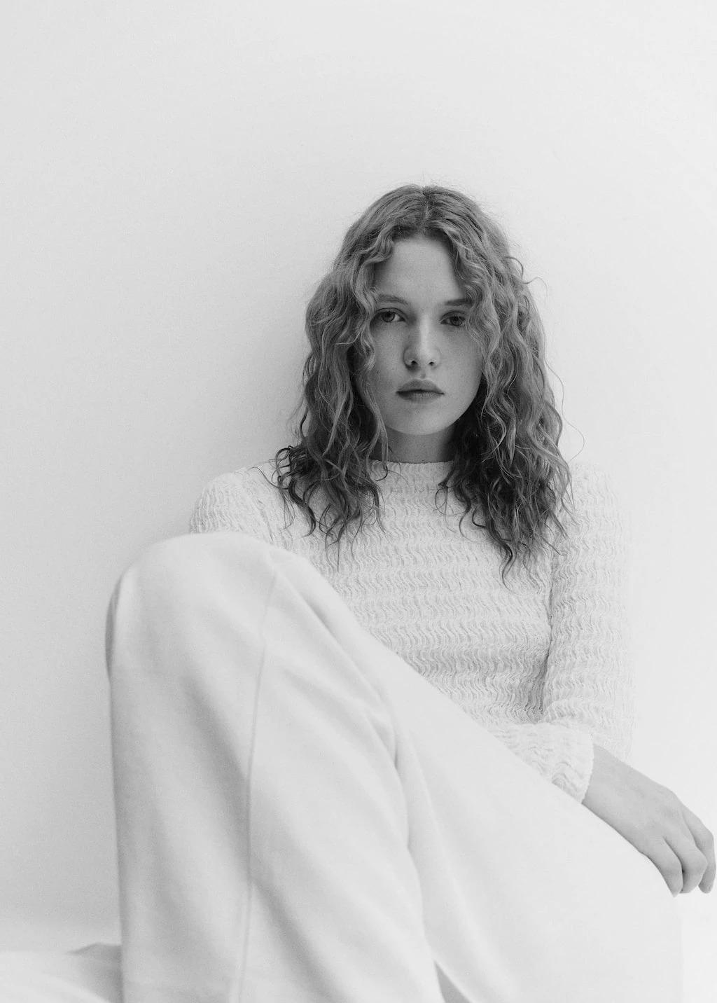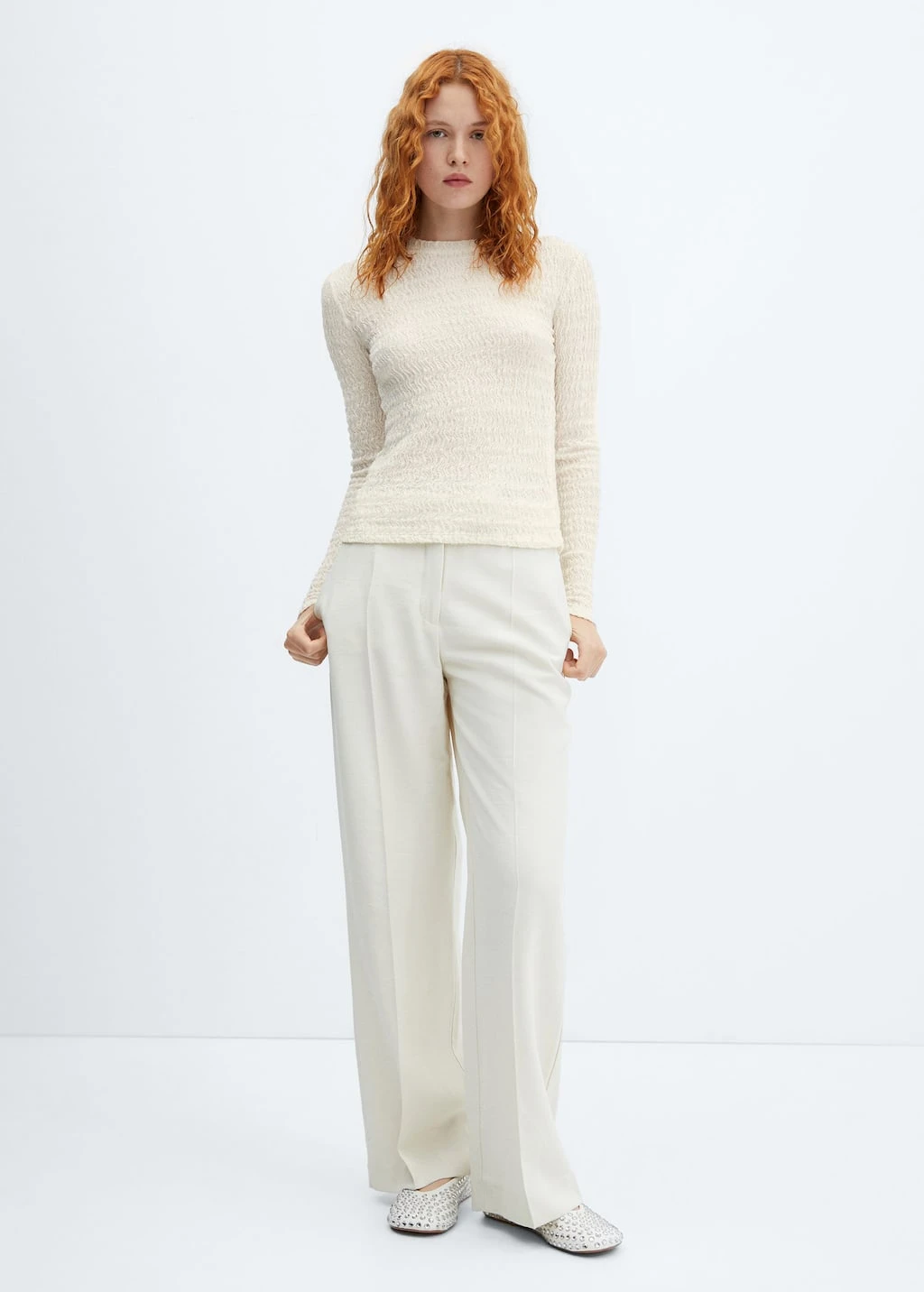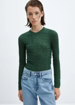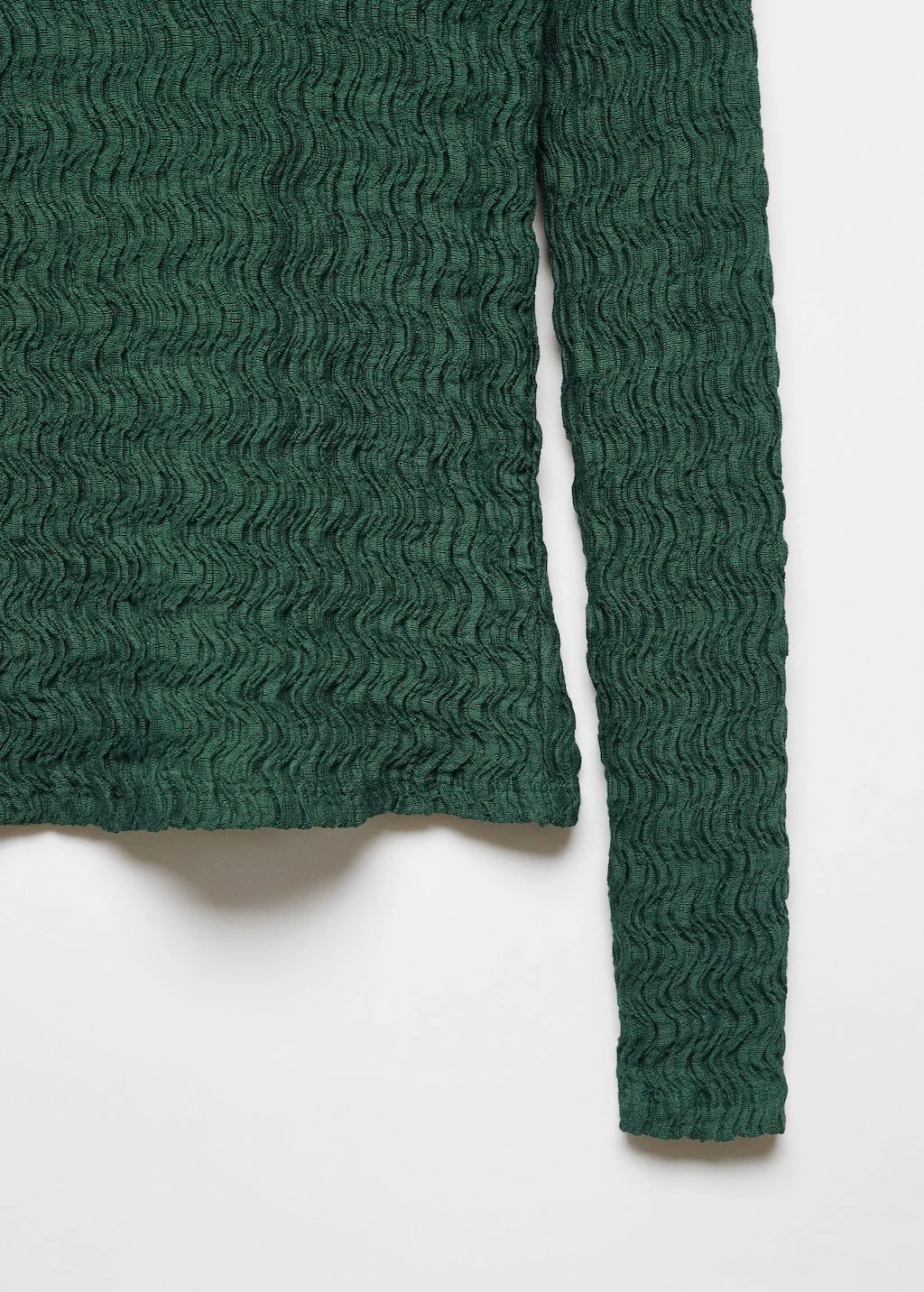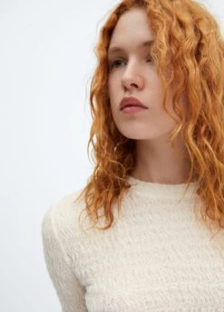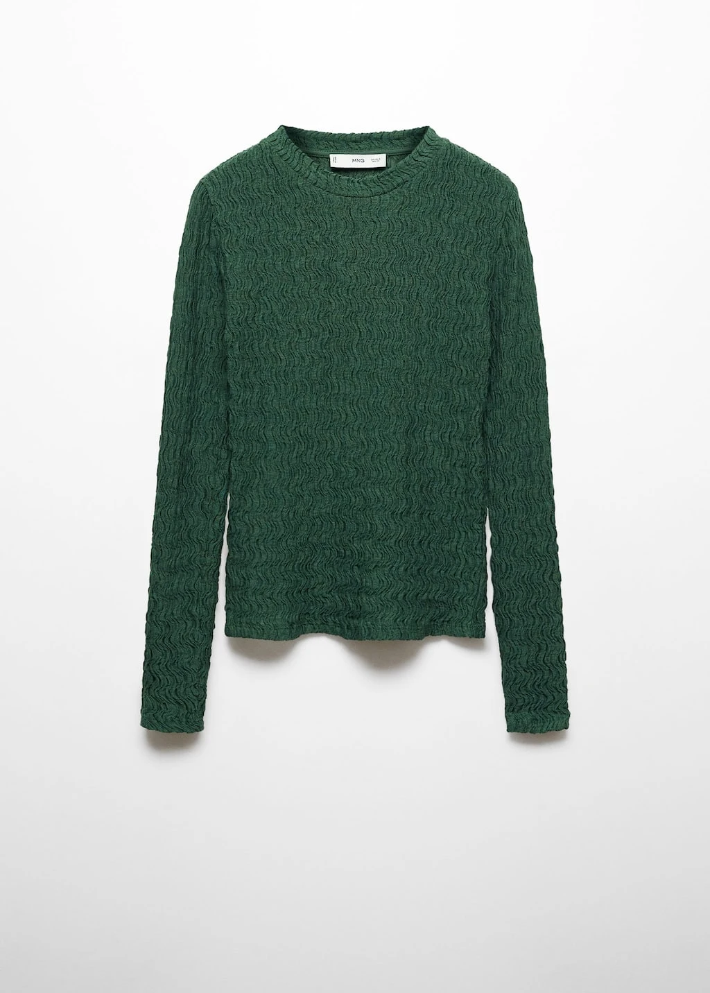 tissu en maille fine, tissu fronce, tissu elastique, coupe cintree, col rond, manches longuesComposition: 64% coton,35% polyester,1% elasthanne