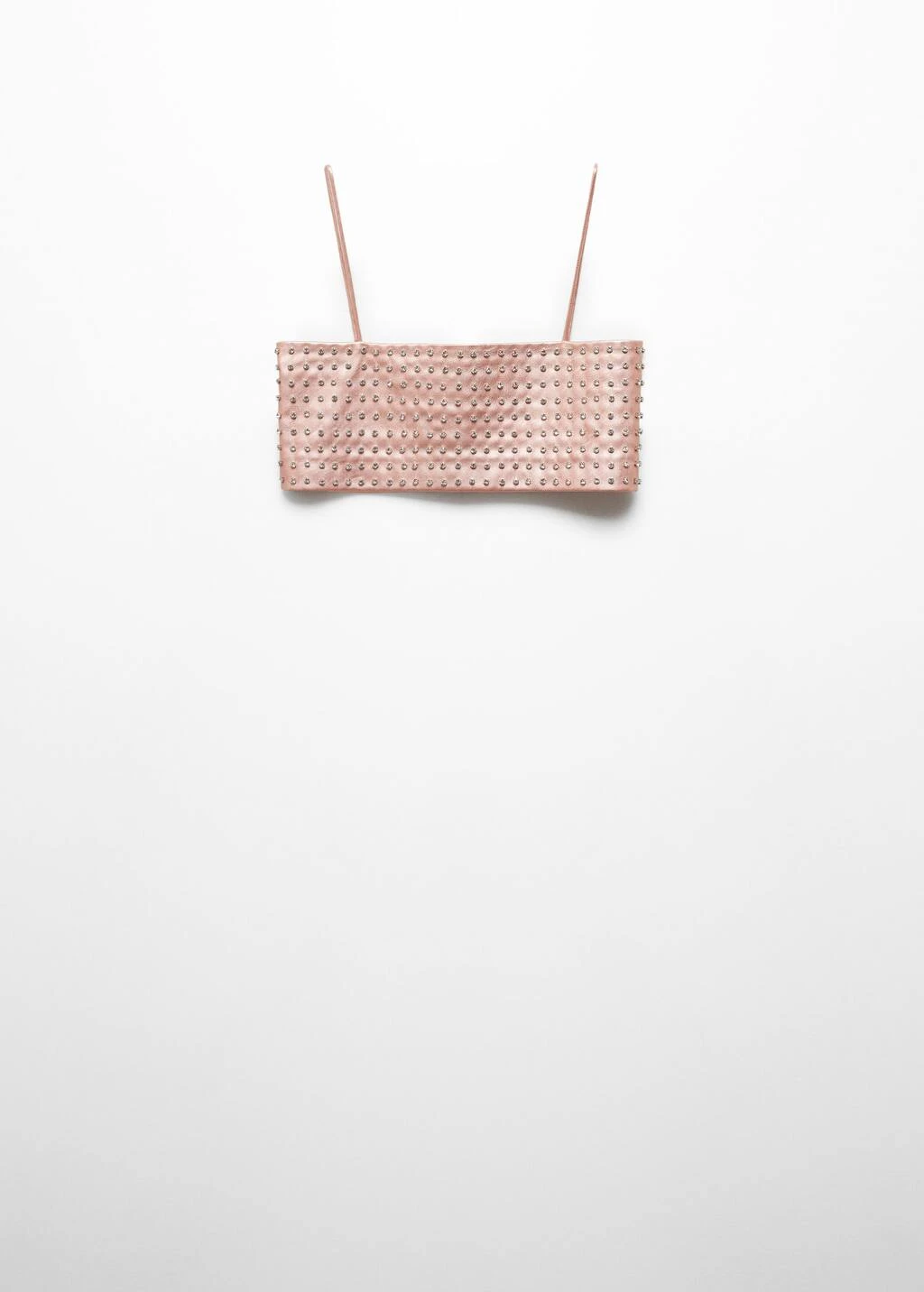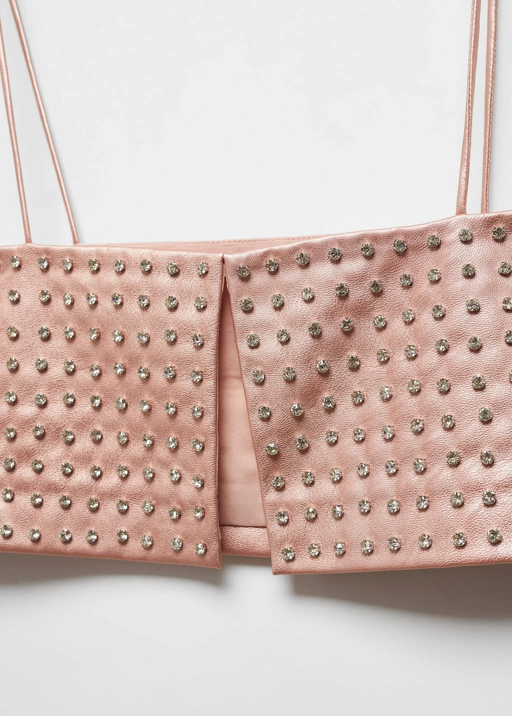 similicuir, style crop, finition metallisee, col droit, sans manches, bretelles fines, fermeture crochet a l’arriere, cristaux a facettes, ouverture au dos, doublure, total look, collection fetes et ceremoniesComposition: 100% polyester. Doublure: 100% polyester. Ornement: 100% verre. RevĂȘtement: 100% polyurethane