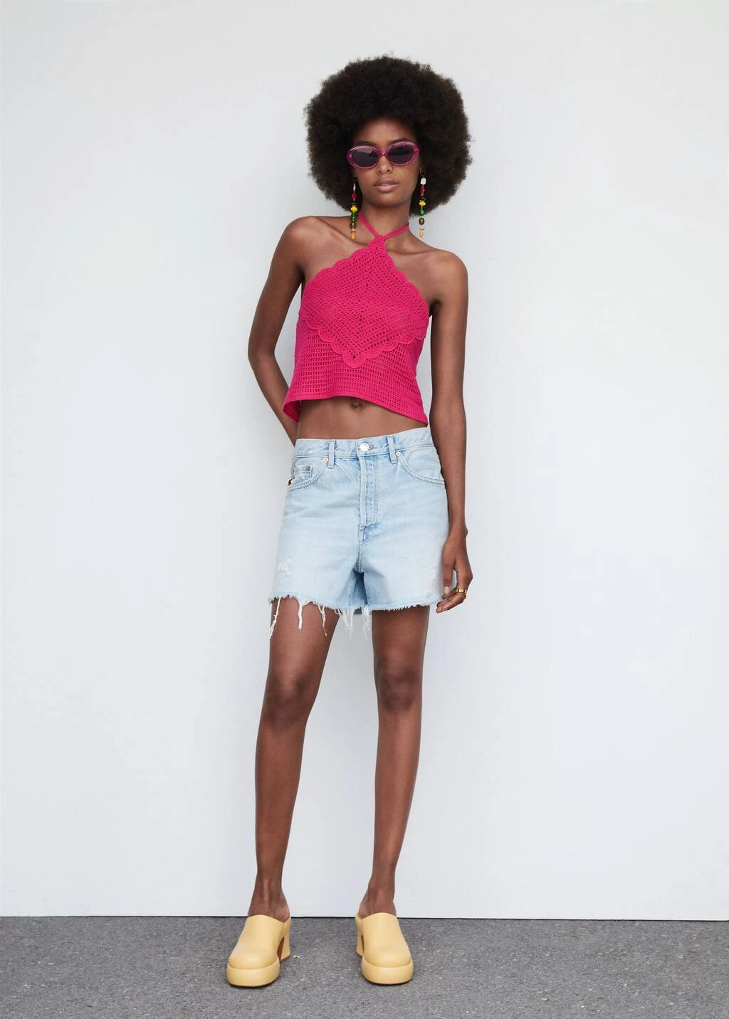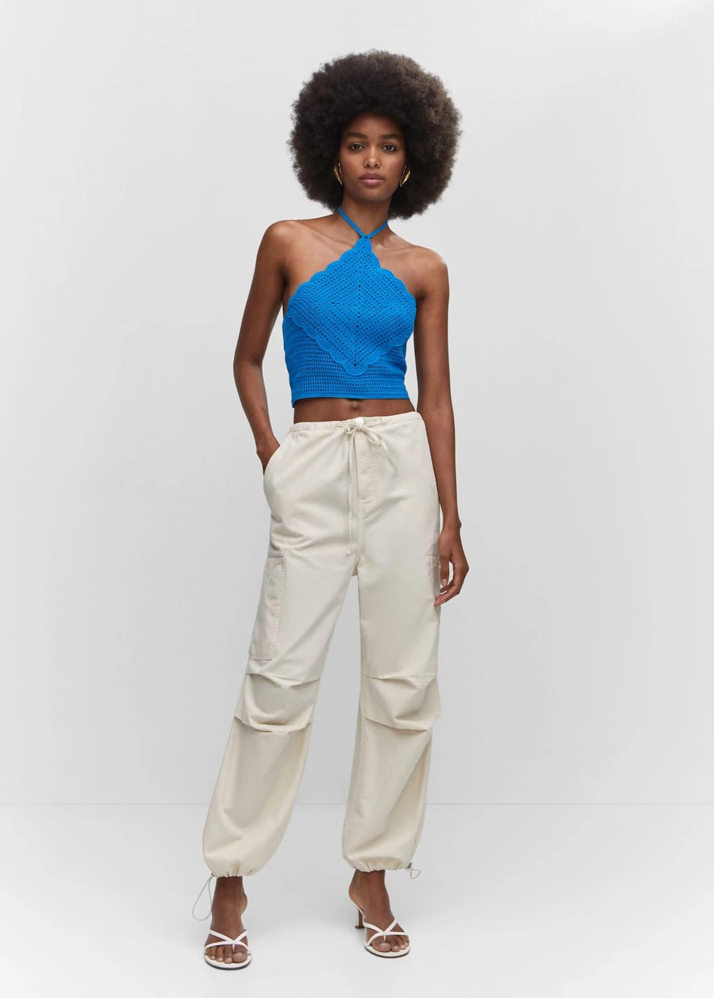 tissu de coton melange, tissu en grosse maille, tissu en crochet, emmanchures americaines, style crop, lien a nouer autour du cou, bretelles fines, saison des festivalsComposition: 60% coton,40% acrylique