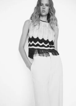 tissu en maille fine, coupe droite, style crop, bicolore, col rond, sans manches, bord frange, sans fermetureComposition: 60% polyester,40% polyester recyclé