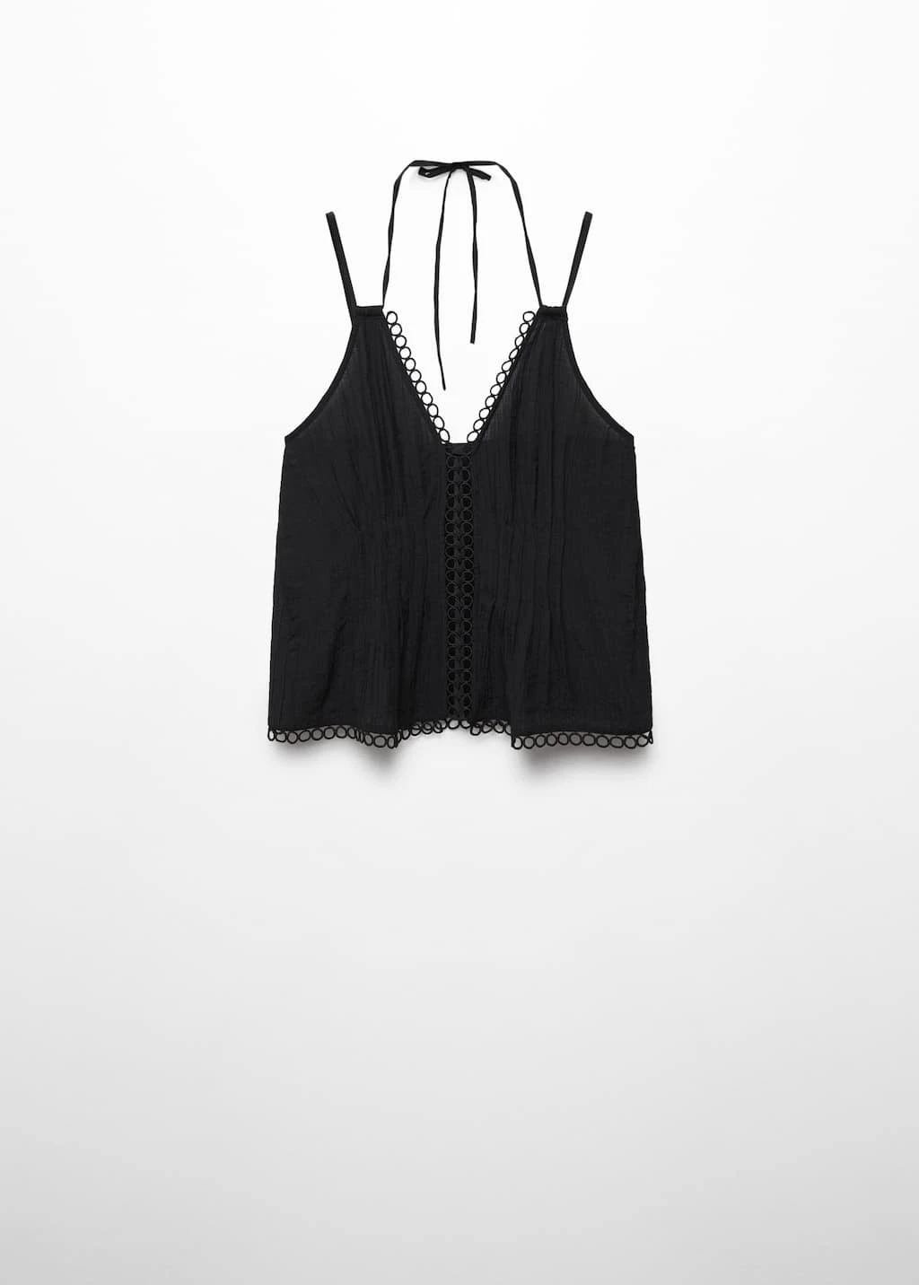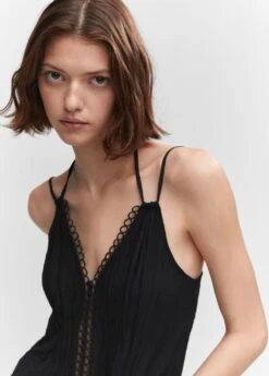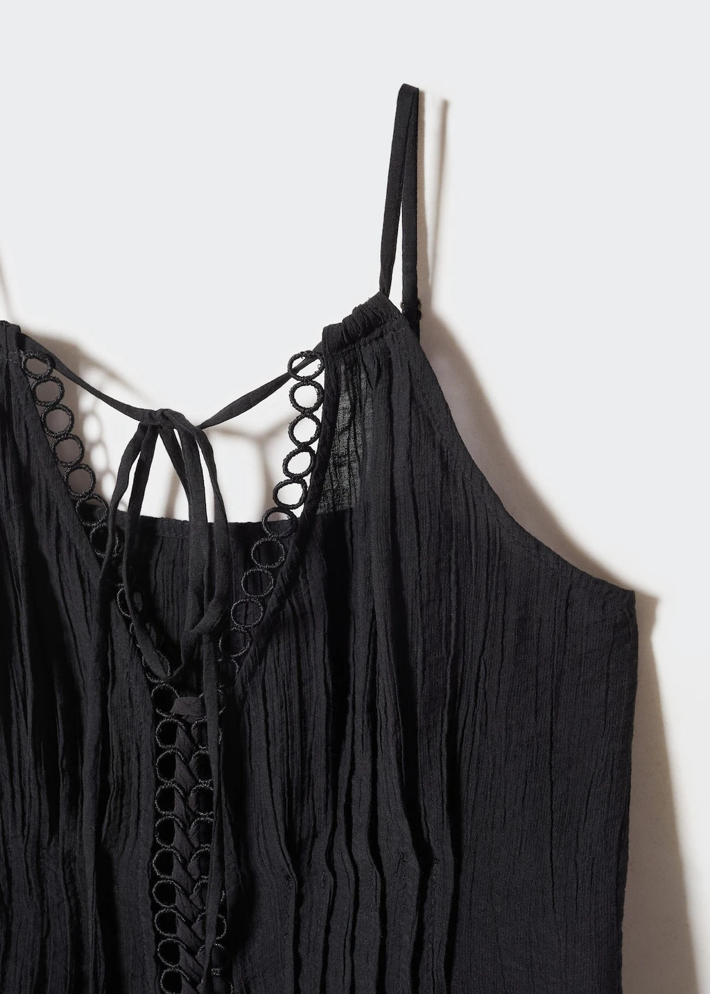tissu plisse, tissu fluide, coupe droite, col en v a nĆud, bretelles fines doubles, bretelles ajustables, lien a nouer au dos, empiecements en dentelle, empiecements ajouresComposition: 82% viscose,18% polyamide. Broderie: 100% polyester