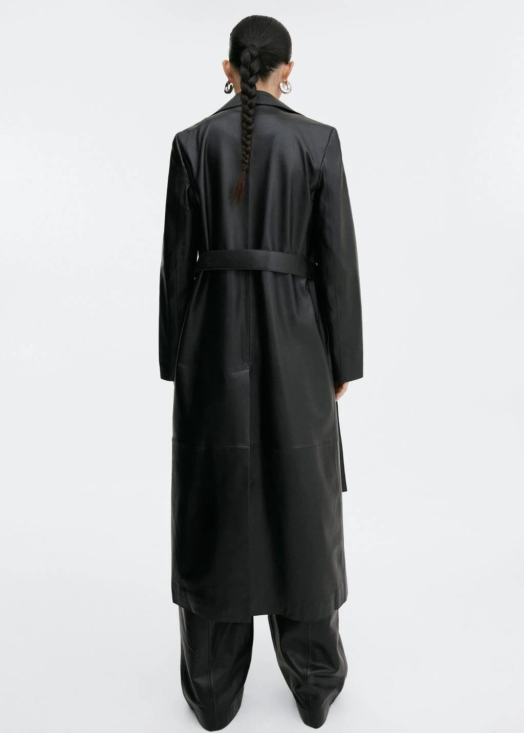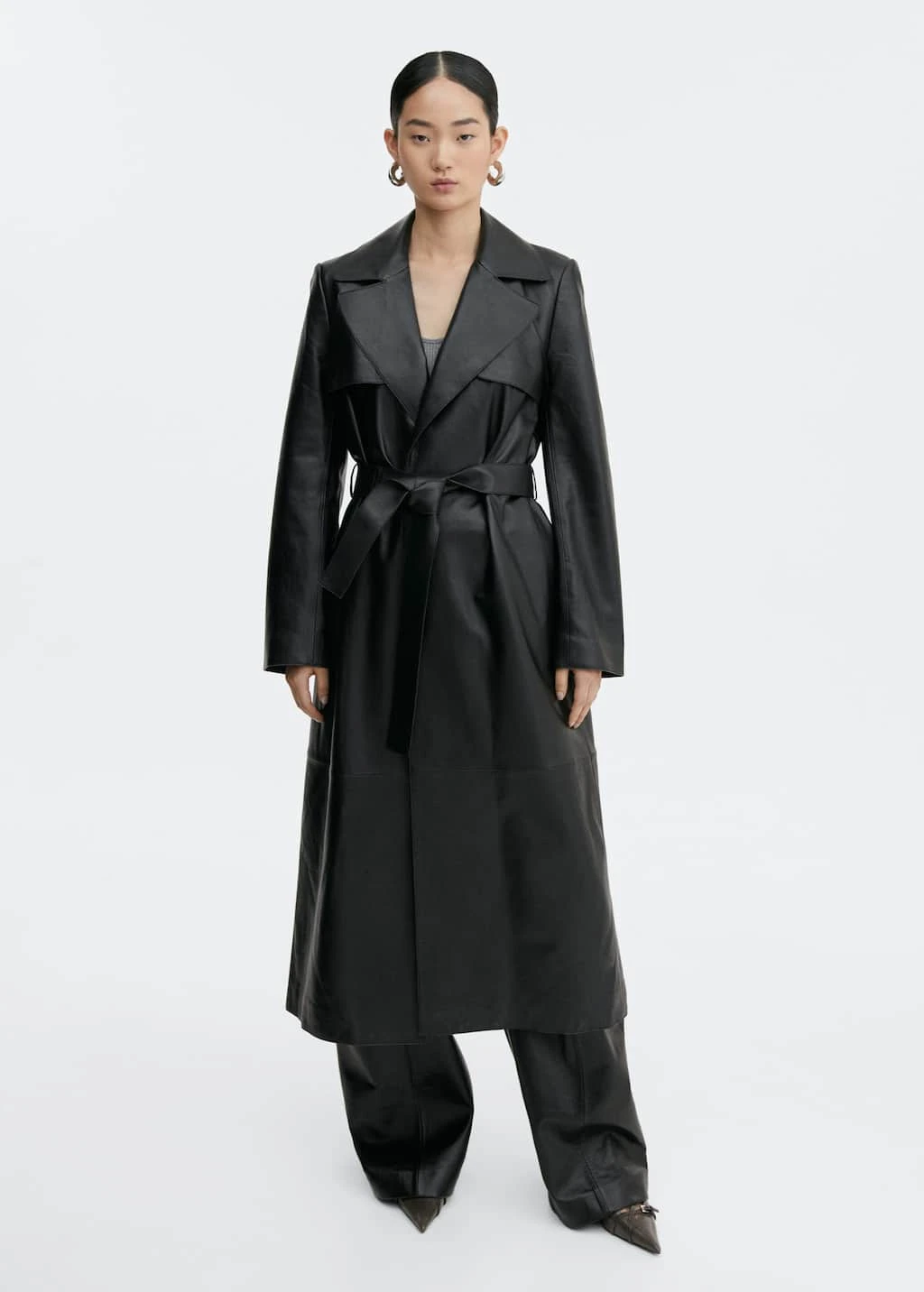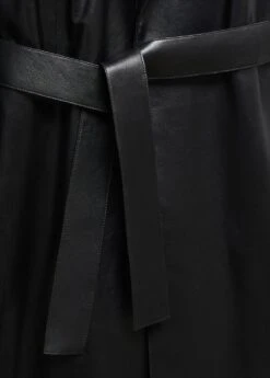 collection selection, tissus et confection de qualite superieure, 100Â % cuir ovin, structure, coupe longue, croise, col a revers, manches longues, deux poches laterales, fermeture boutonnee sur le devant, fermeture a nouer, passants pour la ceinture, ouverture a l’arriere, doublure, une selection de pieces qui vous accompagneront lors du retour au bureau. confectionnee avec des matieres de qualite pour creer une garde-robe feminine et contemporaine pour votre quotidien.