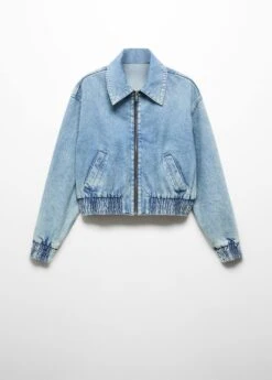 tissu en coton de style jean, droit, style crop, col chemise, manches longues avec poignets elastiques, deux poches laterales, taille elastique, fermeture eclair sur le devantComposition: 100% coton
