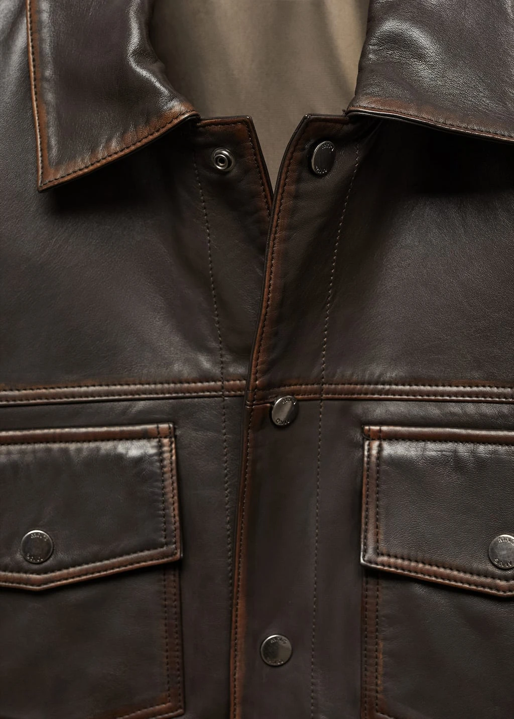 100 % cuir nappa, coupe droite, col chemise, fermeture a l’avant a boutons-pression, deux poches plaquees a rabat sur la poitrine, deux poches avant, le mannequin mesure 190 cm et porte une taille mComposition: 100% cuir ovin. Doublure: 55% polyester,45% viscose. Doublure manches: 55% polyester,45% viscose. Doublure poches: 100% coton
