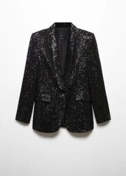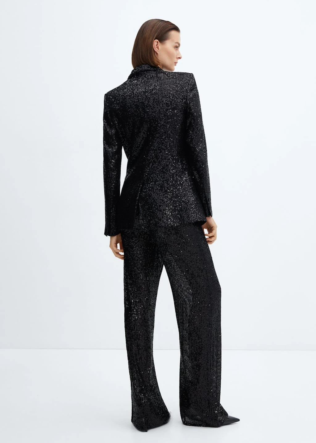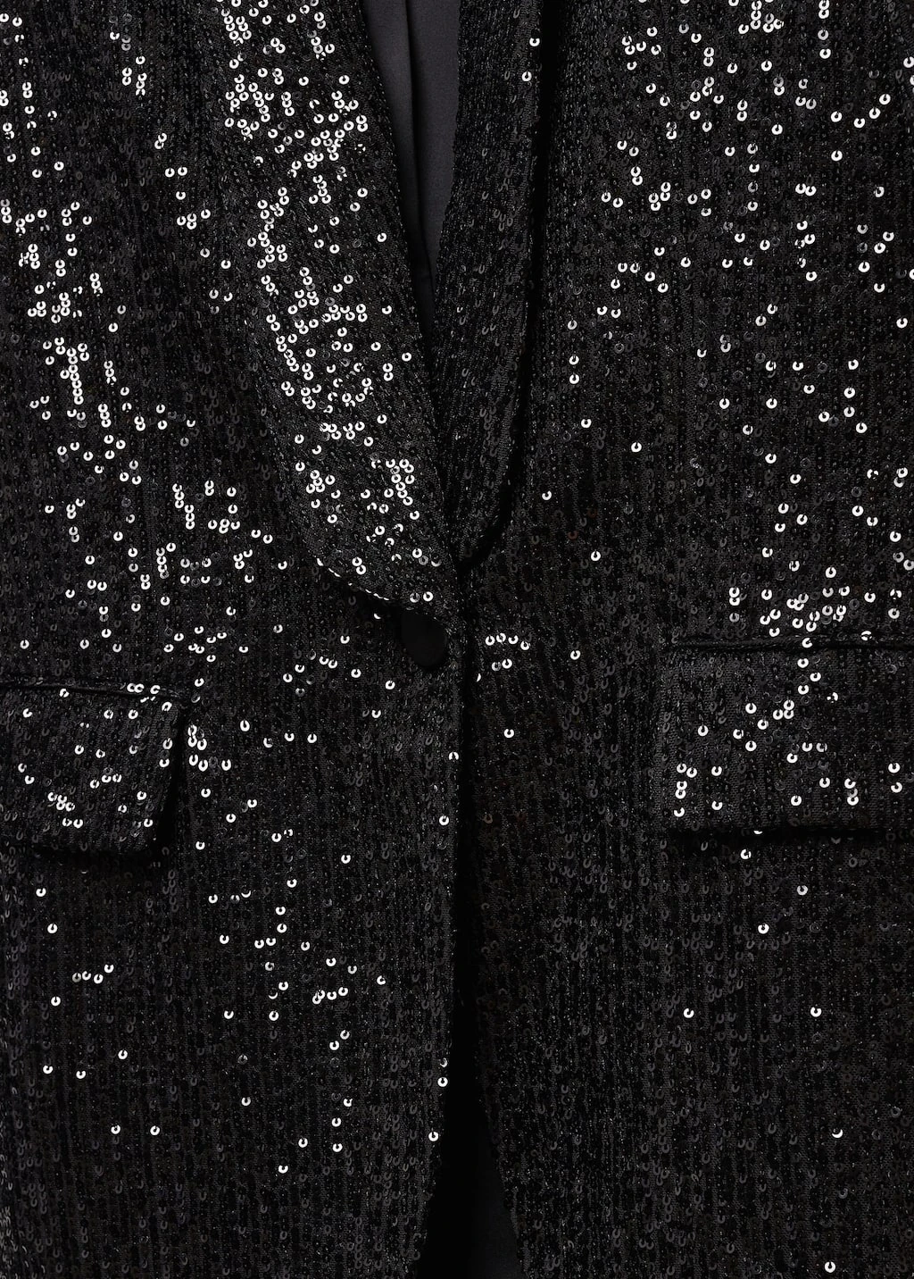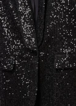 tissu en sequins, droit, col en v avec rabat, manches longues avec poignets boutonnes, deux poches passepoilees et a rabat sur le devant, fermeture a bouton sur le devant, bas fendu a l’arriere, doublure, total look, collection fetes et ceremonies.Composition: 98% polyester,2% elasthanne. Doublure: 100% polyester